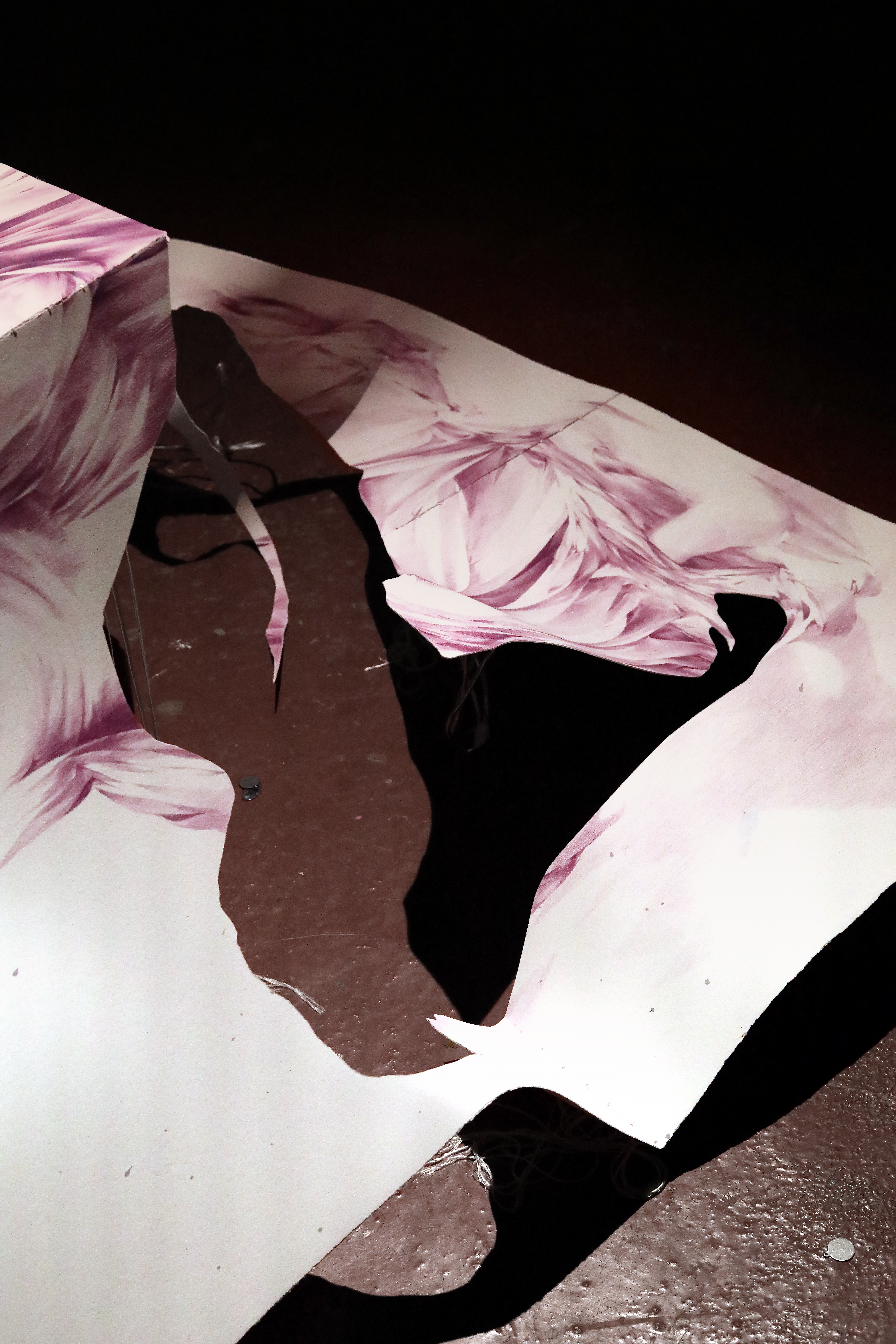 Contrary to traditional representations, the focus in the drawing is placed on the folds of fabric, intricate and dynamic folds, crumples and creases which embrace a contemporary Baroque style to afford depth and richness to the depiction which is echoed in the physical drapery of the drawing. Here the focus sits between the drawn and sculptural form, reflecting on the space between, or at least their nearing proximities. In an Irish lexicon I might think of this as a ‘thin pace’, a point at which the tangible and intangible come within a whisper.  By cutting into the image to remove a figure, the work begun to test the boundaries of image making, the drawing collapsing towards a sculptural form and the negative space leaving a malleable, distorting silhouette.